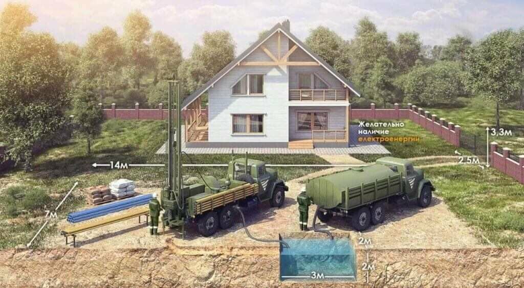 Фахівці починають із геологічних досліджень: визначають, на якій глибині залягає водоносний шар, і складають план робіт. Далі використовується спеціалізована техніка, яка працює навіть на обмежених ділянках. Після завершення буріння монтується обсадна труба та насосне обладнання. У результаті власник отримує готове до використання джерело.
