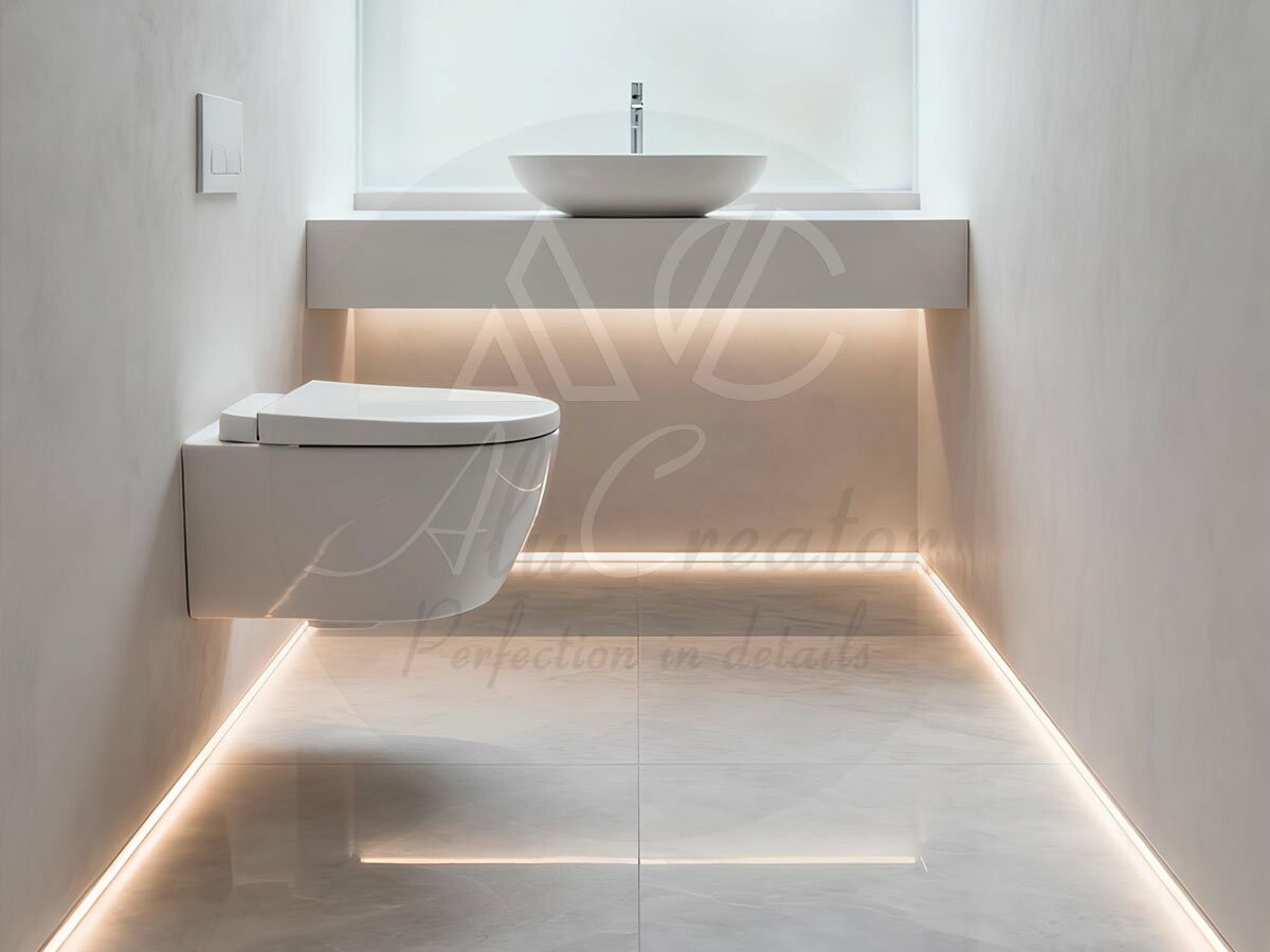 Ванные комнаты и кухни выигрывают от использования алюминиевых плинтусов с подсветкой благодаря влагостойкости материала. Алюминий не боится влаги, не подвержен коррозии, а современные светодиодные ленты выпускаются с различными классами защиты от влаги, включая варианты с полной герметизацией. Мягкая подсветка в ванной создает атмосферу spa-салона, а на кухне может служить дополнительным рабочим освещением в вечернее время.