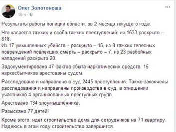Олег Золотоноша отчитался о проделанной работе полиции за два месяца