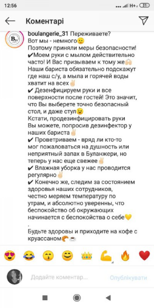 Так вчинила круасанна «Буланжери». На сторінці в Інстаграмі вони запевнили, що піклуються про своїх гостей, тому із задоволенням нададуть дезінфікуючі засоби усім. Керівництво ретельно перевіряють стан здоров’я співробітників. Тому чекають кожного на чашечку кави.
