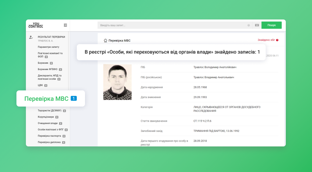 У YouControl ви можете самостійно перевірити людину, чи не перебуває вона у розшуку в модулі «Фізичні особи». Треба ввести ПІБ і ви дізнаєтесь, чи розшукують людину, причина (категорія та стаття) та дату зникнення людини.